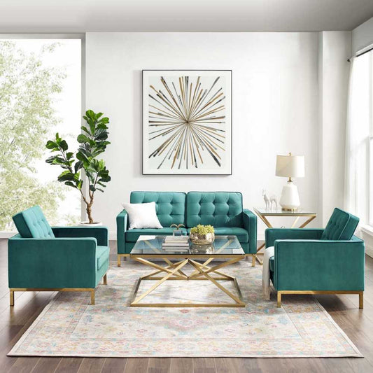 Loft Gold Stainless Steel Leg Performance Velvet 3 Piece Set, Gold Teal, EEI-4096-GLD-TEA-SET