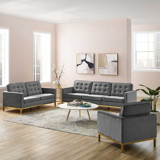Loft Gold Stainless Steel Leg Performance Velvet 3 Piece Set, Gold Gray, EEI-4096-GLD-GRY-SET