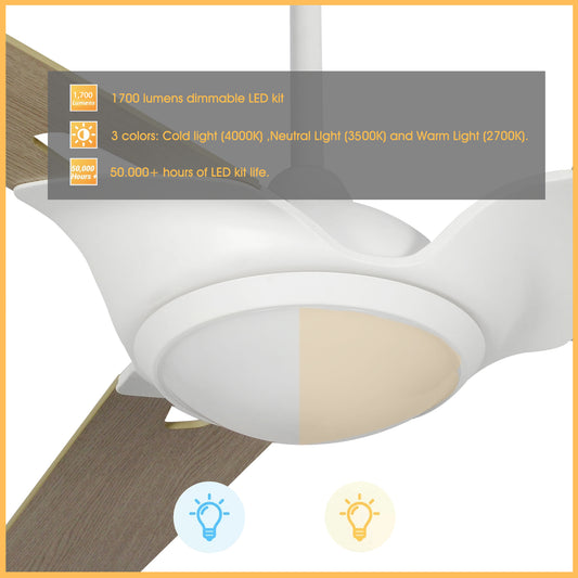 Hoffen 56 Inch 3-Blade Smart Ceiling Fan - White/Light Wood