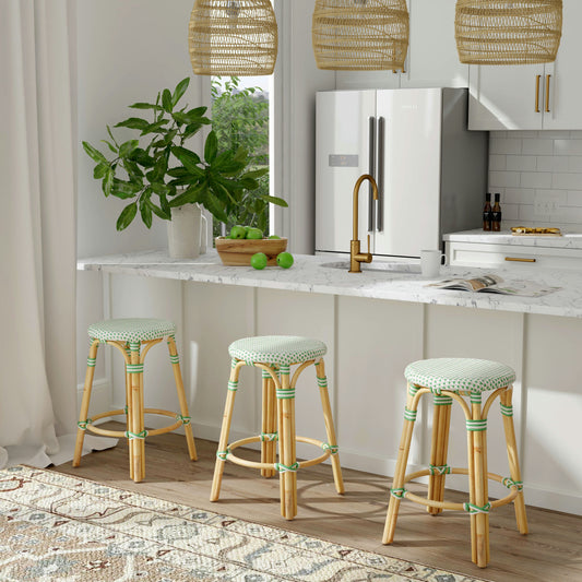 Robias Rectangular Rattan 30" Bar Stool, White and Sky Blue Dot