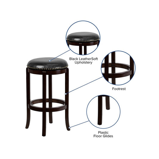 29'' High Backless Cappuccino Wood Barstool with Black LeatherSoft Swivel Seat