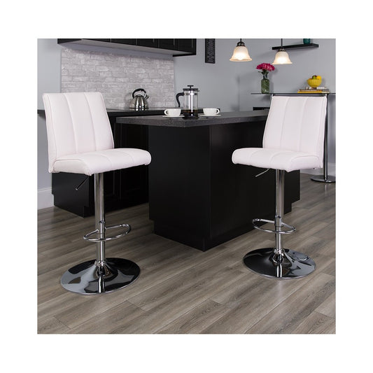 Contemporary White Vinyl Adjustable Height Barstool with Vertical Stitch Panel Back and Chrome Base