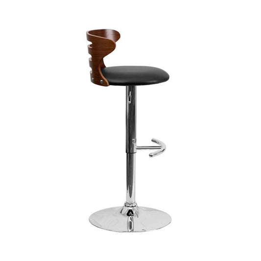Walnut Bentwood Adjustable Height Barstool with Three Slot Cutout Back and Black Vinyl Seat