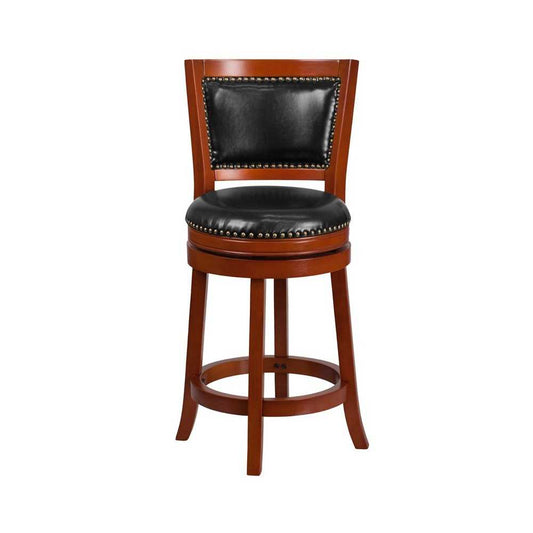 26'' High Light Cherry Wood Counter Height Stool with Open Panel Back and Black LeatherSoft Swivel Seat