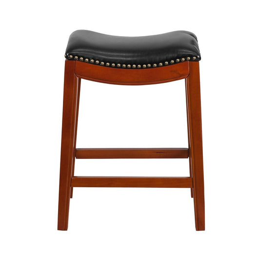 26'' High Backless Light Cherry Wood Counter Height Stool with Black LeatherSoft Saddle Seat