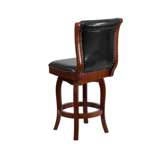 26'' High Cherry Wood Counter Height Stool with Button Tufted Back and Black LeatherSoft Swivel Seat