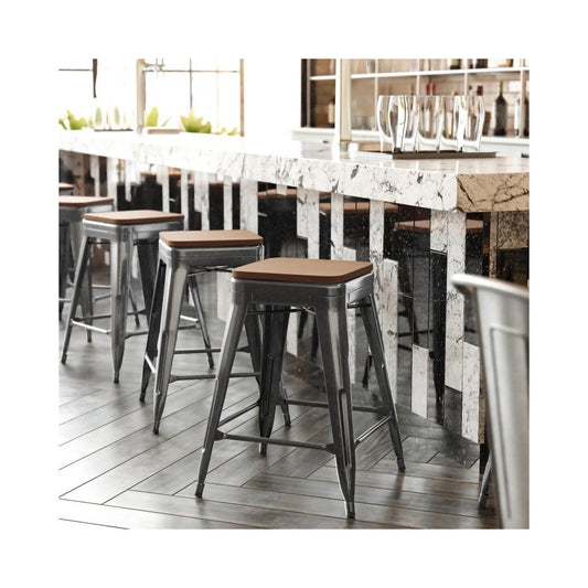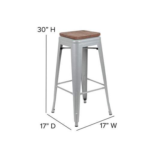 30" High Metal Indoor Bar Stool with Wood Seat in Silver - Stackable Set of 4