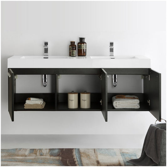 Vista 60" Black Wall Hung Double Sink Modern Bathroom Cabinet w/ Integrated Sink