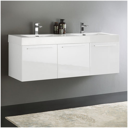Vista 60" White Wall Hung Double Sink Modern Bathroom Cabinet w/ Integrated Sink