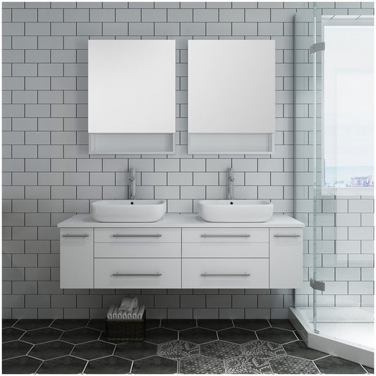 60 White Wall Hung Double Vessel Sink Bathroom Vanity w/ Medicine Cabinets