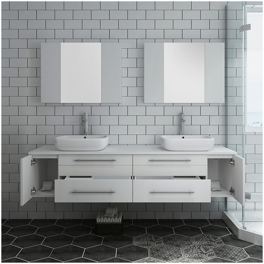 72 White Wall Hung Double Vessel Sink Bathroom Vanity w/ Medicine Cabinets