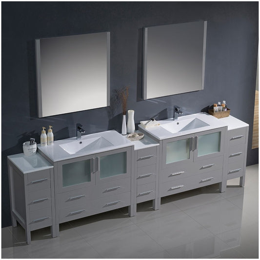 108 Gray Double Sink Bathroom Vanity w/ 3 Side Cabinets & Integrated Sinks
