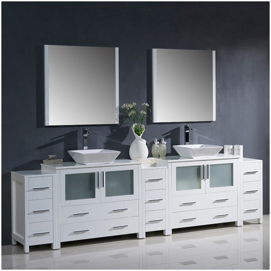 108 White Modern Double Sink Bathroom Vanity w/ 3 Side Cabinets & Vessel Sinks