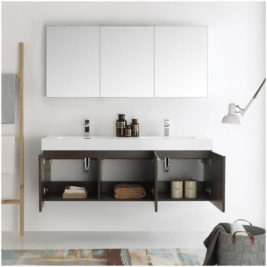 Vista 60 Gray Wall Hung Double Sink Modern Bathroom Vanity w/ Medicine Cabinet