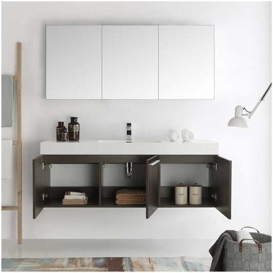Vista 60 Gray Wall Hung Single Sink Modern Bathroom Vanity w/ Medicine Cabinet