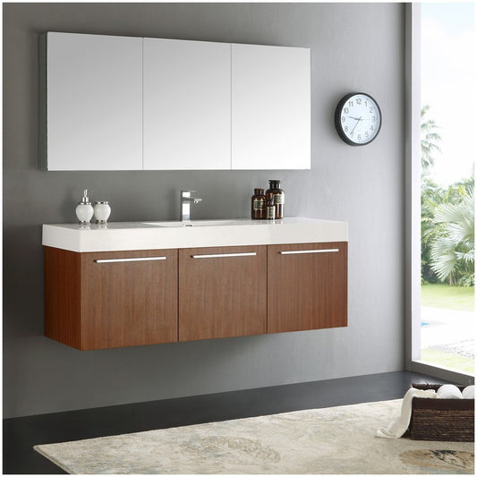 Vista 60" Teak Wall Hung Single Sink Modern Bathroom Vanity w/ Medicine Cabinet