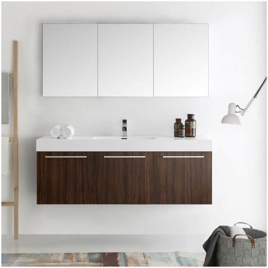 Vista 60 Walnut Wall Hung Single Sink Modern Bathroom Vanity w/ Medicine Cabinet