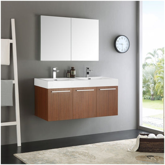 Vista 48" Teak Wall Hung Double Sink Modern Bathroom Vanity w/ Medicine Cabinet