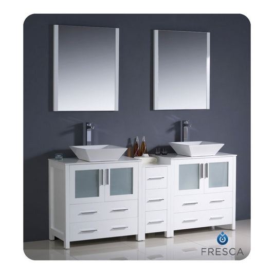 Torino 72 White Modern Double Sink Bathroom Vanity w/ Side Cabinet, Vessel Sinks