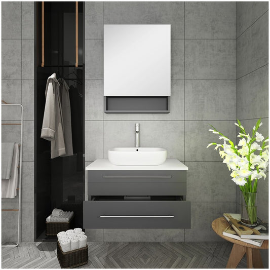 Lucera 30" Gray Wall Hung Vessel Sink Modern Bathroom Vanity w/ Medicine Cabinet