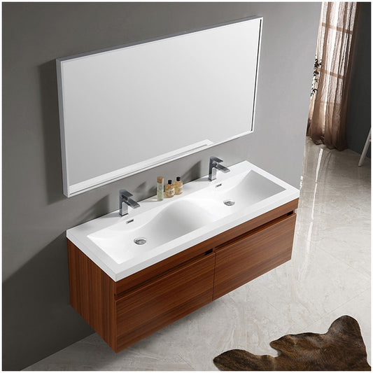 Fresca Largo 57" Teak Modern Bathroom Vanity w/ Wavy Double Sinks