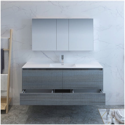 Catania 60 Ocean Gray Wall Hung Single Sink Bathroom Vanity w/ Medicine Cabinet
