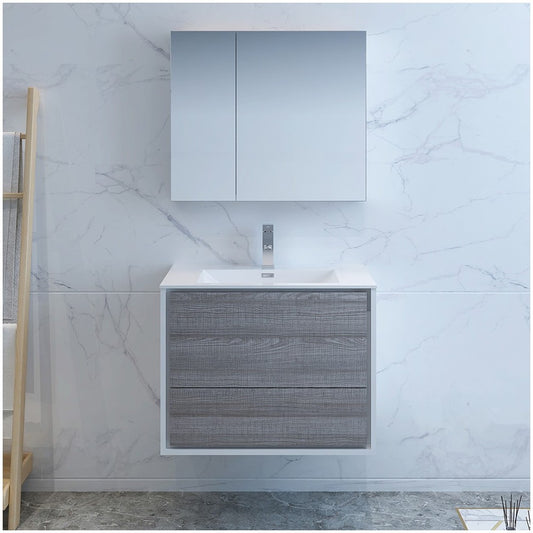 Catania 30" Glossy Ash Gray Wall Hung Modern Bathroom Vanity w/ Medicine Cabinet