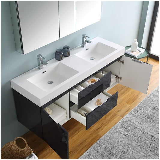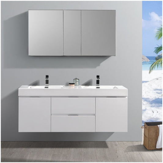 60 White Wall Hung Double Sink Modern Bathroom Vanity w/ Medicine Cabinet