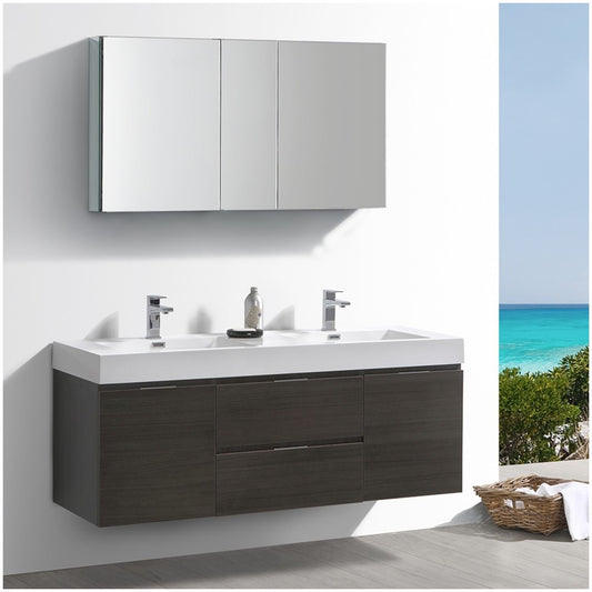 60 Gray Oak Wall Hung Double Sink Modern Bathroom Vanity w/ Medicine Cabinet