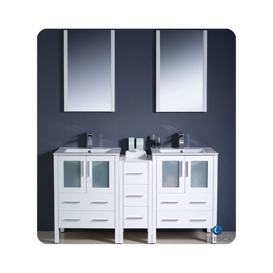 60 White Modern Double Sink Bathroom Vanity w/ Side Cabinet & Integrated Sinks