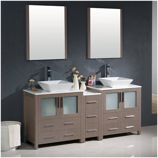 72 Gray Oak Modern Double Sink Bathroom Vanity w/ Side Cabinet & Vessel Sinks