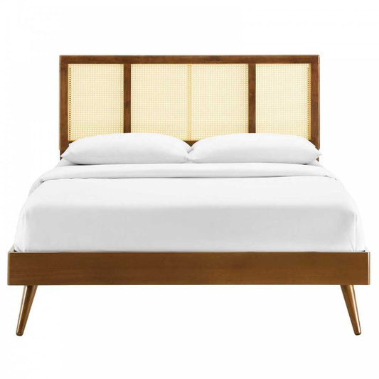 Kelsea Cane and Wood Queen Platform Bed With Angular Legs, Walnut