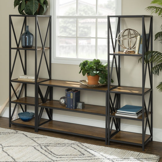 3-Piece Rustic Industrial Bookcase Set - Dark Walnut