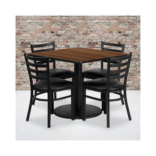 36'' Square Walnut Laminate Table Set with Round Base and 4 Ladder Back Metal Chairs - Black Vinyl Seat