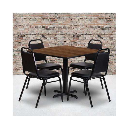 36'' Square Walnut Laminate Table Set with X-Base and 4 Black Trapezoidal Back Banquet Chairs