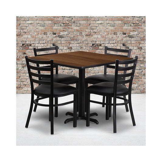 36'' Square Walnut Laminate Table Set with X-Base and 4 Ladder Back Metal Chairs - Black Vinyl Seat
