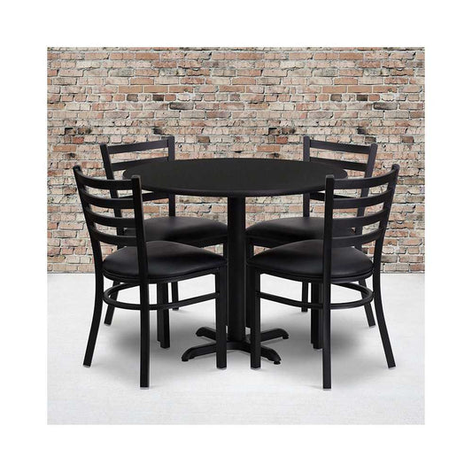 36'' Round Black Laminate Table Set with X-Base and 4 Ladder Back Metal Chairs - Black Vinyl Seat