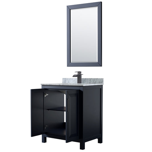 Daria 30" Single Vanity in Dark Blue, Carrara Marble Top, Black Trim, 24" Mirror