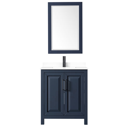 Daria 30" Single Vanity in Dark Blue, White Marble Top, Black Trim, 24" Mirror
