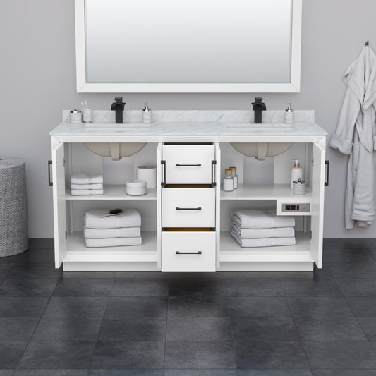 Strada 66" Double Vanity in White, White Carrara Marble Top, Sink, Black Trim