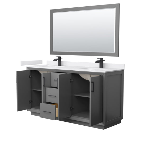 Strada 66" Gray Double Vanity, White Marble Top, Sink, Black Trim, 58" Mirror