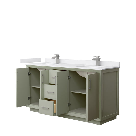 Strada 66" Double Vanity in Green, White Marble Top, Sinks, Nickel Trim