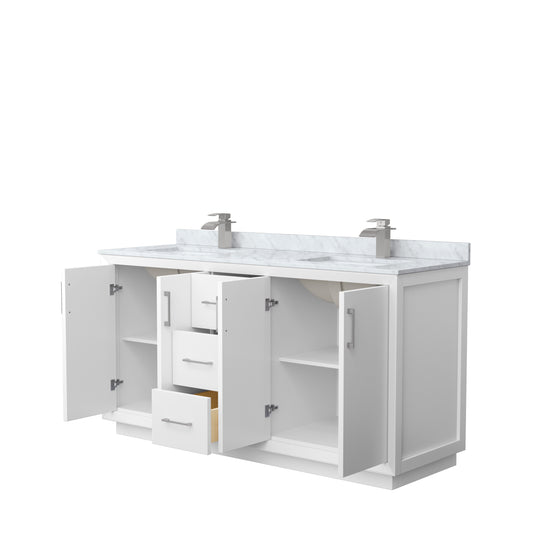 Strada 66" Double Vanity in White, White Carrara Marble Top, Sink, Nickel Trim
