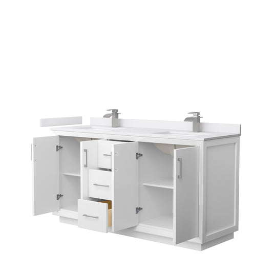 Strada 66" Double Vanity in White, White Marble Top, Sink, Nickel Trim