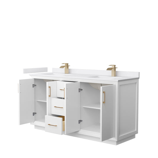 Strada 66" Double Vanity in White, White Marble Top, Sink, Bronze Trim