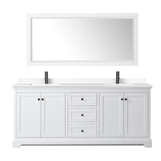 Avery 80" Double Vanity in White, White Marble Top, Black Trim, 70" Mirror