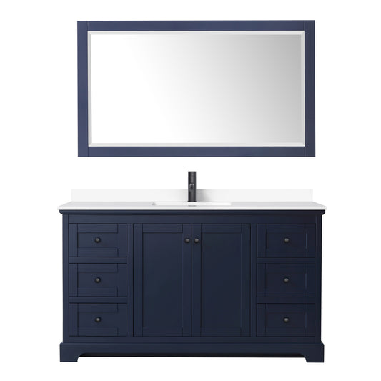 Avery 60" Single Vanity in Dark Blue, White Marble Top, Black Trim, 58" Mirror