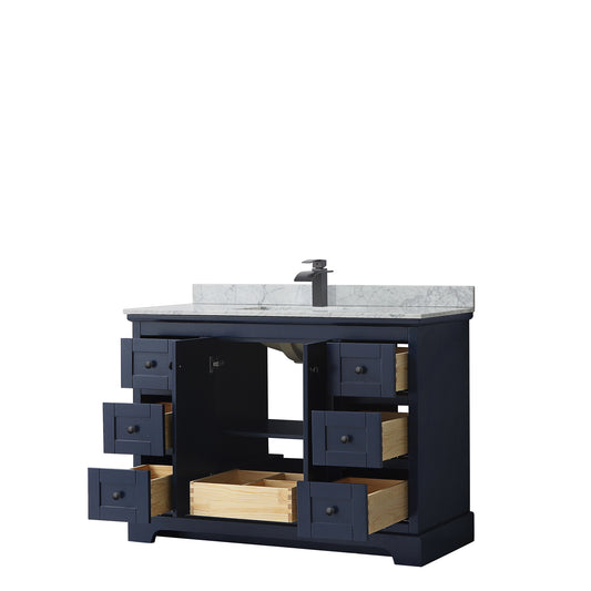 Avery 48" Single Vanity in Dark Blue, White Marble Top, Black Trim, 46" Mirror