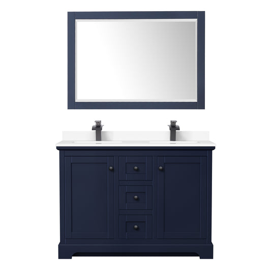 Avery 48" Double Vanity in Dark Blue, White Marble Top, Black Trim, 46" Mirror