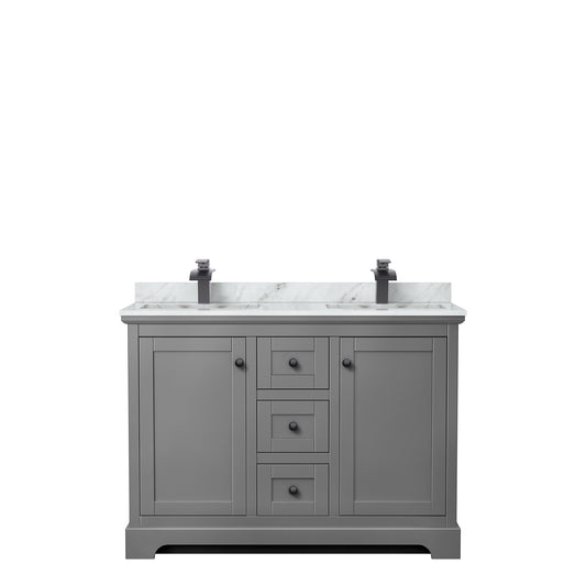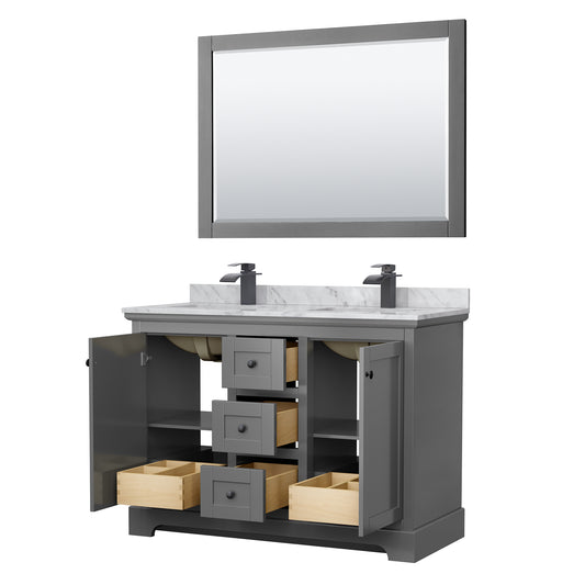 Avery 48" Double Vanity in Dark Gray, Carrara Marble Top, Black Trim, 46" Mirror